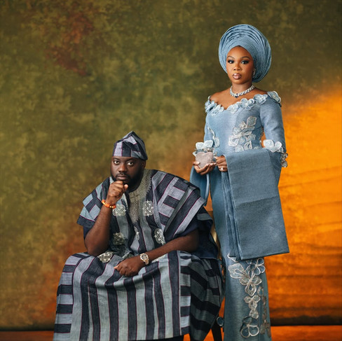 Donned in traditional Yoruba male three-piece aso-oke consisting of Bùba, Sòkòtò, and Agbádà, the groom, Mide, is draped right, carrying the authority of tradition meeting modern finesse.